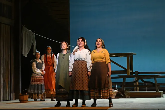 "Manich and Mirageas assembled a cast with opera-worthy voices, most of whom are successful at leaving the operatic vocal bombast behind and letting the simplicity of the composer Jerry Bock’s tunes guide the way. Finding that balance is difficult, but the singers playing Tevye and Golde’s three oldest daughters – Rachel Kobernick (Tzeitel), Rachel Blaustein (Hodel) and Jennifer Zetlan (Chava) – mastered it."
